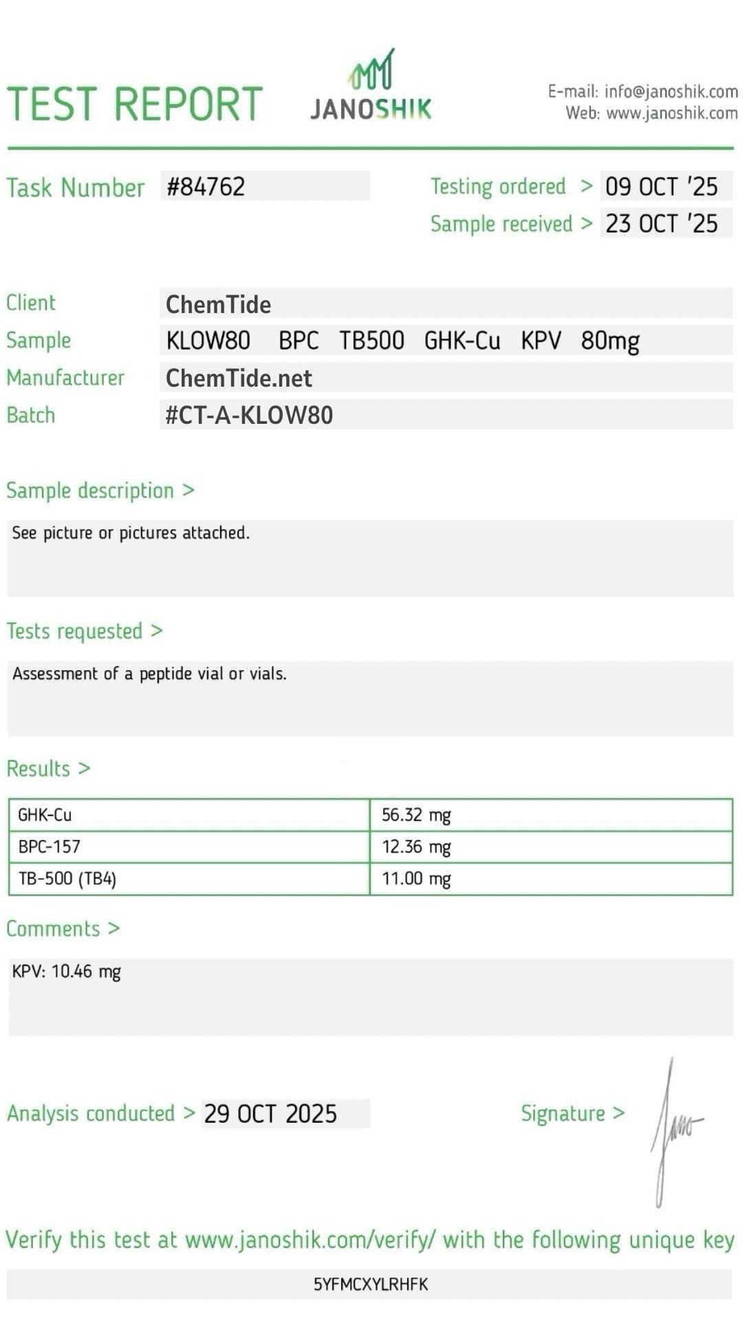 By purchasing Klow Blend (Batch CT-A-KLOW80), the buyer confirms that they are a qualified professional or institution, that the product will be used only for lawful research purposes, and that they understand and accept ChemTide’s Research Use Only, Terms of Use, and Return & Refund Policy.